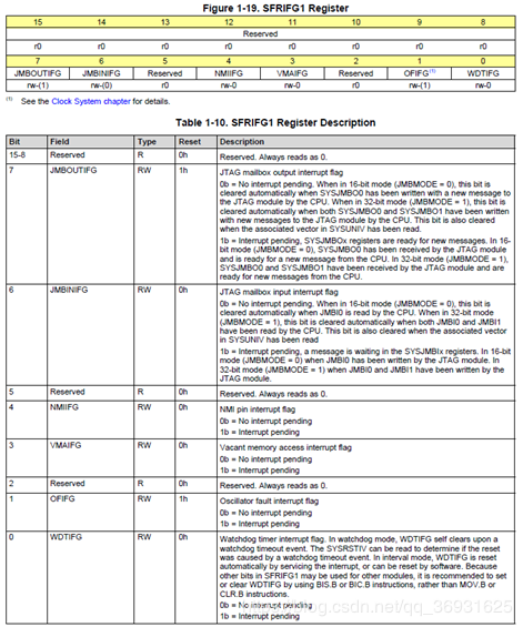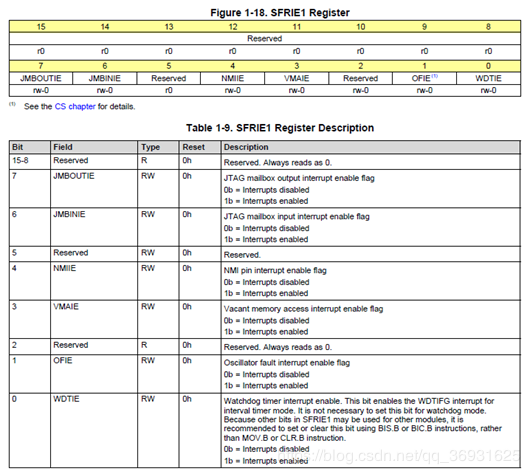 同时,细心的话你会发现,如果正常使用看门狗功能的话,还缺少两个寄存器:中断使能寄存器和中断标志位寄存器。这两个参数WDTIE和WDEIFG分别在SFRIE1.0和SFRIFG1.0寄存器中,如下图所示: