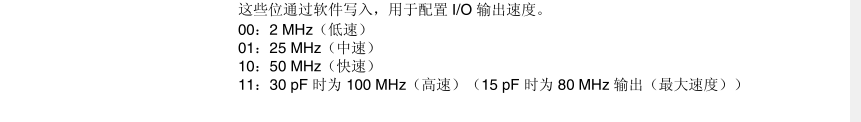 关于GPIO的速度配置,这里指的是输出模式下,每秒最大的输出速度,举个例子:如果我配置为2MHz的输出模式,然后引脚交替输出高电平和低电平,此时引脚每秒只能翻转2M的次数。