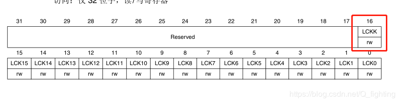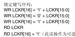 这个寄存器用于锁定引脚的配置,当特定的写序列写入到LCKK位时,将会锁定LCK0~LCK15中值位1的引脚的配置。