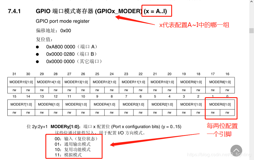 从图中可以看出,GPIOx的“x”代表当前要配置的是哪组GPIO的引脚,每组GPIO有16个引脚,而寄存器共32位,每两位控制一个引脚的配置。