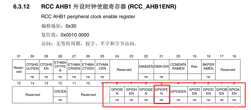 首先我们需要打开PF8的时钟电源,GPIO的所有时钟开启都在“RCC_AHB1ENR”寄存器中