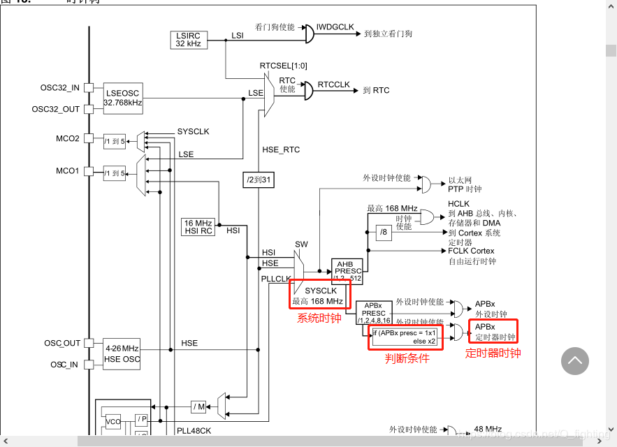 由图可知,系统时钟(SYSCLK 168MHz)经过“APBx PRESC”分频后输出到定时器时钟。