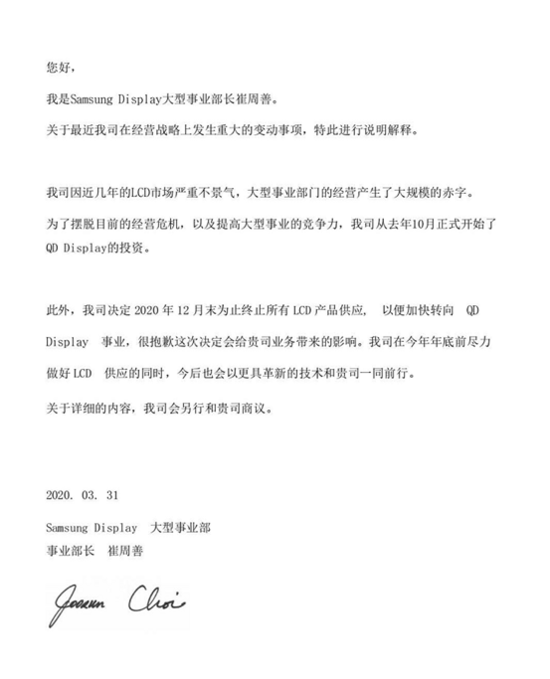3月31日,三星显示大型事业部长崔周善正式就公司在LCD面板经营战略上发生重大的变动事项进行说明解释。