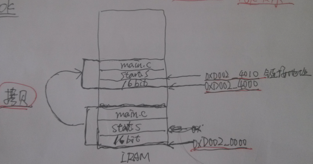 IRAM的大小96k,其实前两个程序都在这里运行的,程序都小于16K。要实现的是从把IRAM从的前16k从IRAM的起始地址0xD0020000拷贝到0xD0024000 处,调用main。堆栈指针设置到了0xD003_7D80处。程序的链接地址是0xD0024010.用图表示如下。本程序只涉及到IRAM,重点为在于重定向。