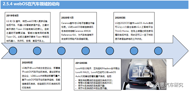 LG 在 2013 年从惠普收购了由 Palm 开发的 webOS,然后将 webOS 从手机操作系统扩展到现在可以在电视、智能冰箱、智能手表、智能汽车上可用的操作系统。安装 webOS 的智能电视已经销售数百万台。2020 年初,LG 的 webOS 在汽车领域频频布局。