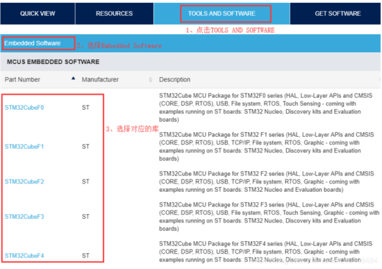【在网页中间偏下(如下图),点击“EMBEDDED SOFTWARE”切换到库软件,选择需要下载的库(看你芯片型号),同样也需要登陆账号】