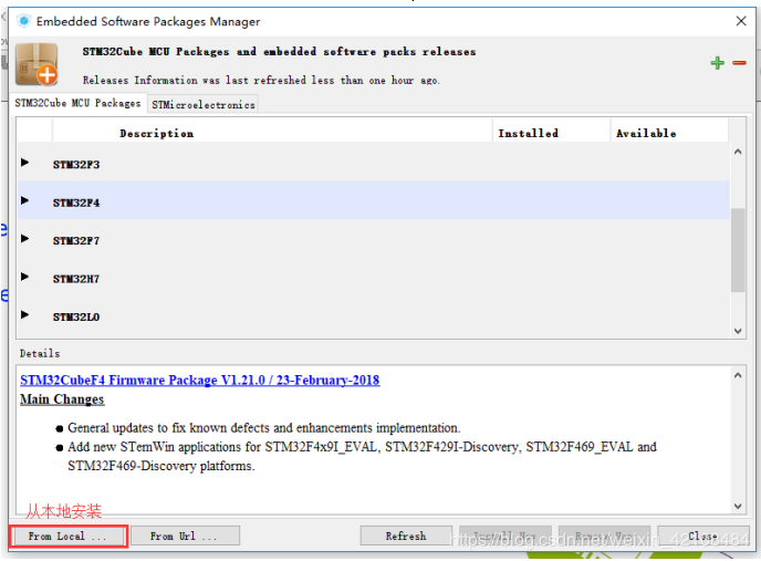 下载好需要安装的离线包(也就是上面章节下载的库),进入库管理界面(Help -> Manage embedded software packages),会有一个列表,点击左下角的“From Local” -> 弹出文件选择框(选择下载的离线包文件),点击“Open”,进入解压安装过程,直到安装完成。如下图: