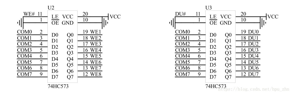 下面,我们来简单介绍一下这款芯片: 对于74HC573,形象一点,我们只需要将其理解为一扇大门,只不过这扇大门是单向的,其中11引脚(LE)控制着门的开、关状态,高电平为大门打开,低电平为大门关闭。D0-D7为输入,Q0-Q7为输出,在LE = 1,即输入高电平时,输入端=输出端,输入是什么,输出也就原封不动的输出;在LE = 0 ,即输入高电平时,大门关闭,实现锁存,不再输出。了解之后,我们按照电路图,来进行编程,代码实现。