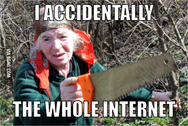 在格鲁吉亚,一位上了年纪的女士用自家花园的锯子挖穿了一条地下电缆。她把电缆所用的铜当成废铁卖给了垃圾回收站,这导致邻国亚美尼亚中断了 5 小时的网络连接。她被媒体称为「锯子黑客」。