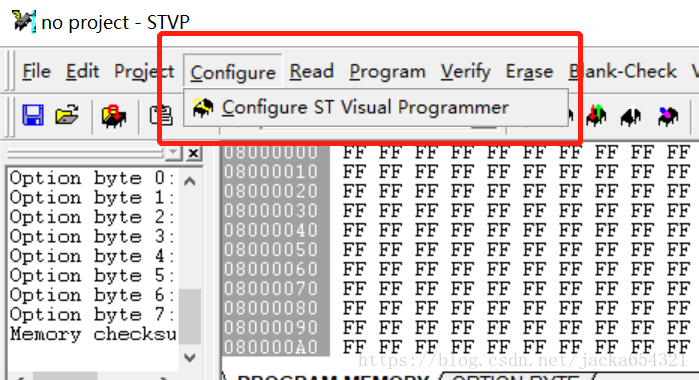 4、打开STVP,选择configure菜单栏下的configure ST Visual Programmer,弹出如图所示的界面,选择ST-LINK,SWD模式,再选择自己芯片的型号,点击确定;