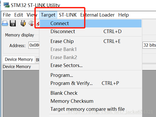 5、打开STM32 ST-LINK Utility软件。在菜单栏中找到菜单项“Target”,点击子菜单“connet”,查看 状态栏信息,提示ST-LINK已经连接、目标板已经连接;