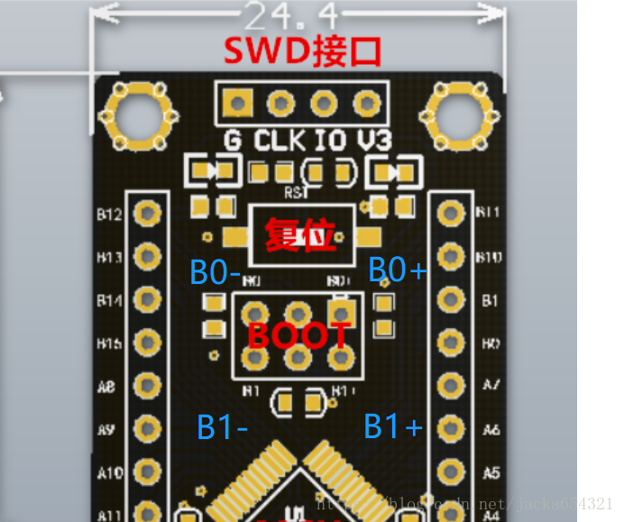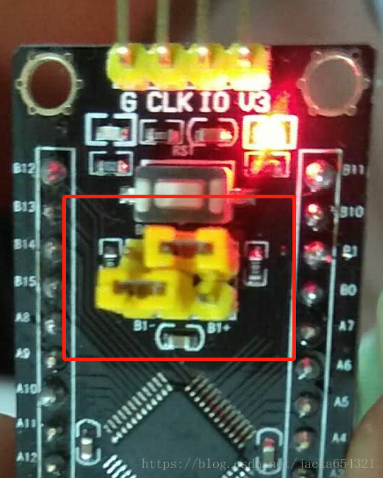 跳线帽 复位,boot0:VCC(B0+)变为默认的状态,boot0:GND(B0-);
