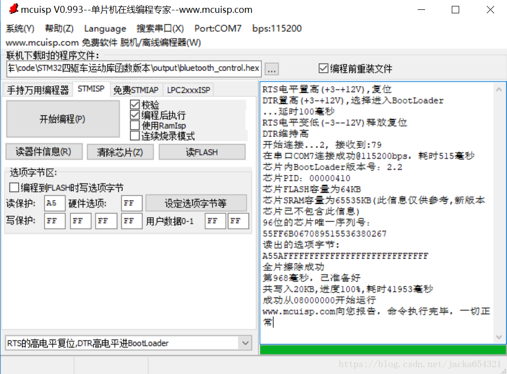 打开mcuisp.exe下载软件; 选择开发板上USB转串口生成COM7;