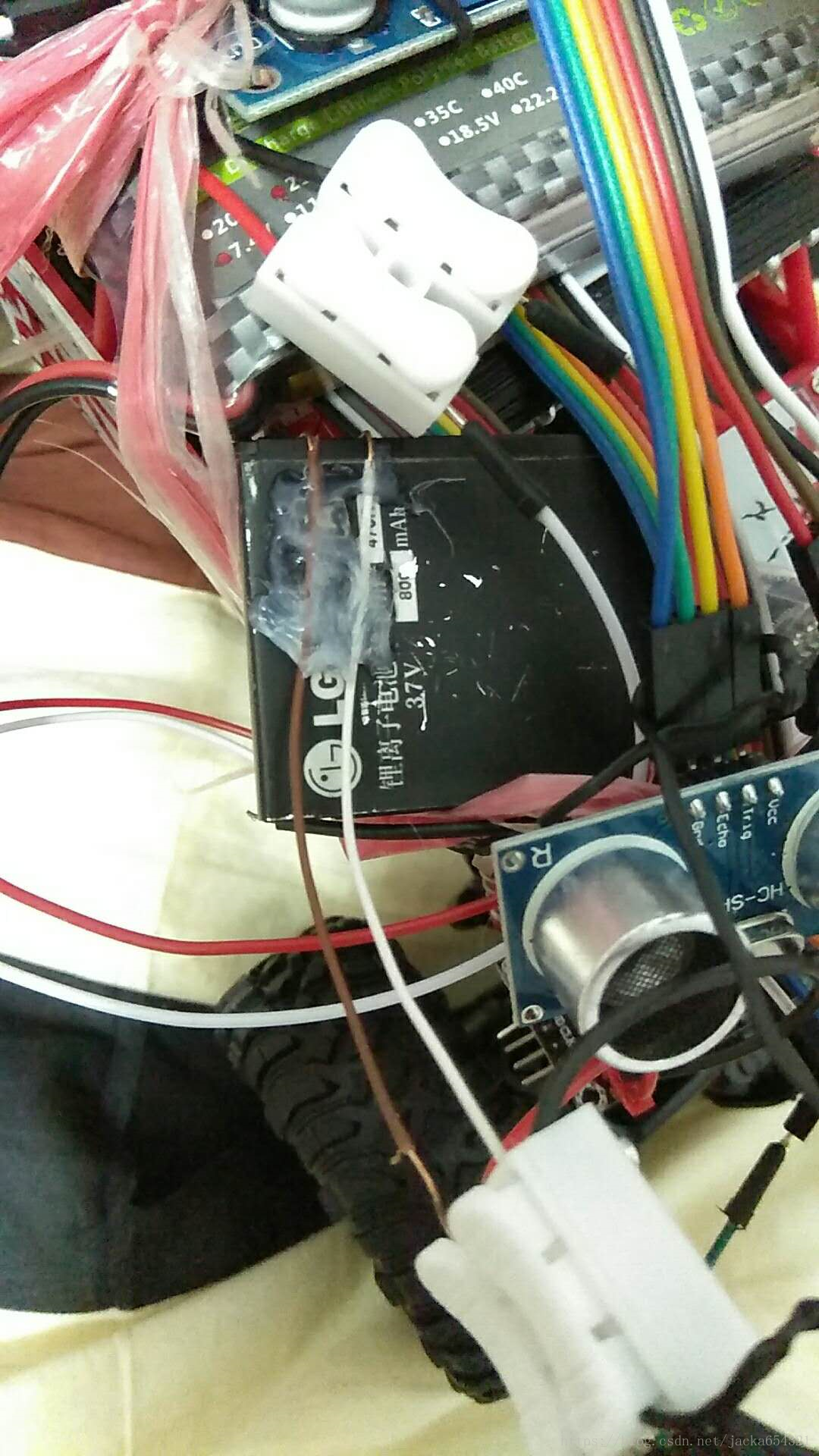 整车测试发现,5V1A充电宝跟7.2V锂电池,固定在车上很重,越野车很容易倾斜,只能低速运动,还有该STM32只有3.3V的引脚,还需要5V USB供电,这样需要跟换双USB接口的充电宝,重量又增加了;还好有另一个可以替换;引脚对应接起来,再接一对杜邦线给5V 和 GND供电即可,换成2600mAH 3S动力锂电池;终于可以脱线测试,越野底盘的优势得以展现;