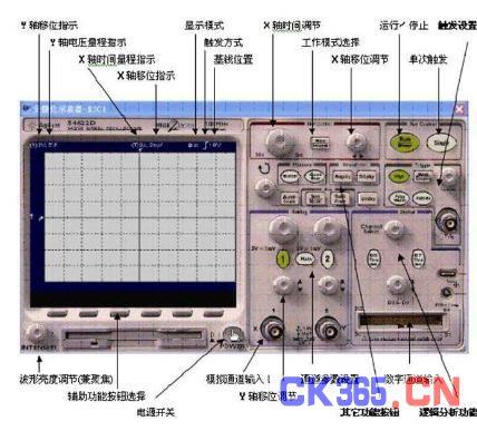 Agilent54622D虚拟示波器的带宽为100MHz,具有两个模拟通道和16个逻辑通道。图一是它的放大面板图,它的各个开关、按钮及旋钮的排列和调节都和实物仪器完全一样,我们在自己的电脑里也能享受到使用高档次测量仪器的愉悦,且没有损坏仪器的担忧。