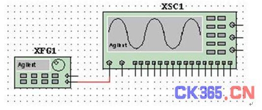 首先在电子仿真软件MultiSIM9电子平台上调出安捷伦虚拟函数信号发生器和安捷伦虚拟示波器各一台。并按图二连好电路;双击安捷伦虚拟函数信号发生器图标"XFG1"打开电源开关,不作任何设置使用它的默认值,即:频率1kHz,幅值100mVpp的正弦波(可参阅上期介绍)。
