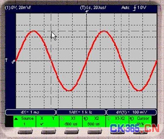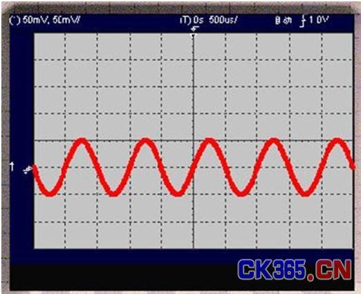 经以上调整结果,从屏幕上可以看到如图三所示波形,从图上我们通过屏幕上方显示的数据可以读出1kHz正弦波的周期是1mS、幅度为100mV,与安捷伦虚拟函数信号发生器设置相符,波形中心离开X轴为50mV,屏幕上的波形已被适当加粗。