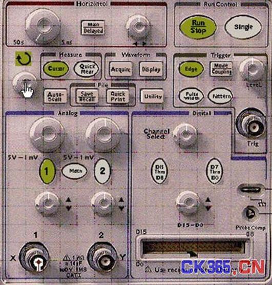 点击安捷伦虚拟示波器放大面板上的"Cursor"(光标)按钮,屏幕下方"辅助功能按钮"上方将出现6个绿色矩形框,分别注明为"Source1"、"XY"、"X1(或Y1)"、"X2(或Y2)"、"X1-X2(或Y1-Y2)"和"Cursor40%"等字样,见图四。