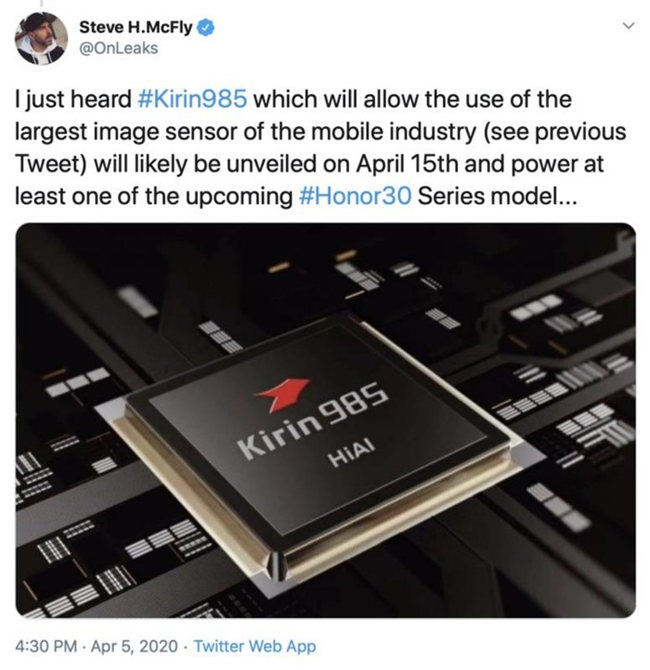 2020年04月07日 | 荣耀30系列部分特性曝光,或首发麒麟985芯片