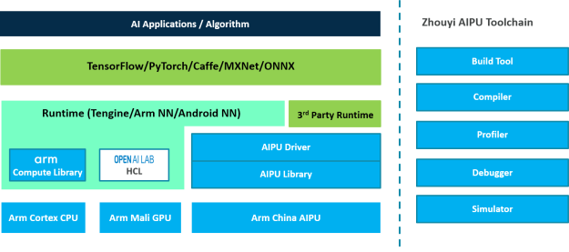 为了方便开发者的AI开发,Arm中国在发布AIPU的同时,还发布了周易 AIPU 软件工具链。基于这个工具链,用户可以快速开发基于周易 AIPU 的算法,优化和部署人工智能应用,同时还支持支持 Android、Linux、RTOS 等操作系统和 Bare-metal 方式。