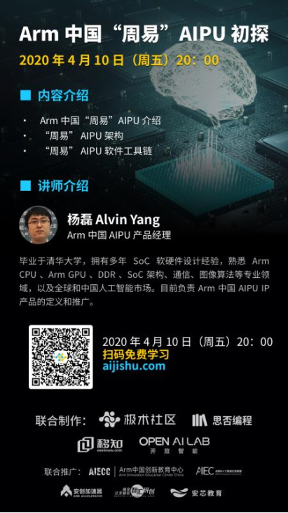 为了让开发者对“周易”AIPU有更深的认识,Arm中国AIPU产品经理杨磊将会在周五举办一场线上研讨会,为大家介绍周易AIPU及其架构与软件工具链,欢迎各位扫码参与直播学习。