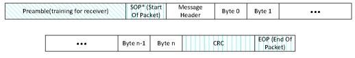 BMC码是一种单线通信编码,数据1的传输,需要有一次高/低电平之间的切换过程,而0的传输则是固定的高电平或者低电平。每一个数据包都包含有0/1交替的前置码,所有的PD传输流程,都是以SOP Packet开始,起始码(SOP),报文头,数据位,CRC以及结束码(EOP)。