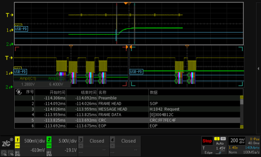 目前ZDS系列示波器不仅能够支持USBPD的协议解码,并且也支持QC2.0/3.0协议的解码,可以满足目前主流快充协议的解码需求,并且在其高达512M的大存储机制下,可支持超长时间的解码还原真实波形,完整监控通信过程;且具有双ZOOM分析功能,可用主时基捕获需要统计数据的波形,通过Zoom1定位一段时间的特征值,再由Zoom2放大波形细节,观测瞬时信号变化,大大提升了工程师的测试便捷性。
