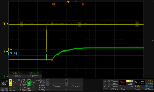 USB OTG端(从设备:适配器端)监控VBUS上电压状态,如果有VBUS的5V电压存在并且检测到OTG的ID脚是1K下拉电阻则说明该电缆支持USBPD通信,此时通信过程开始。