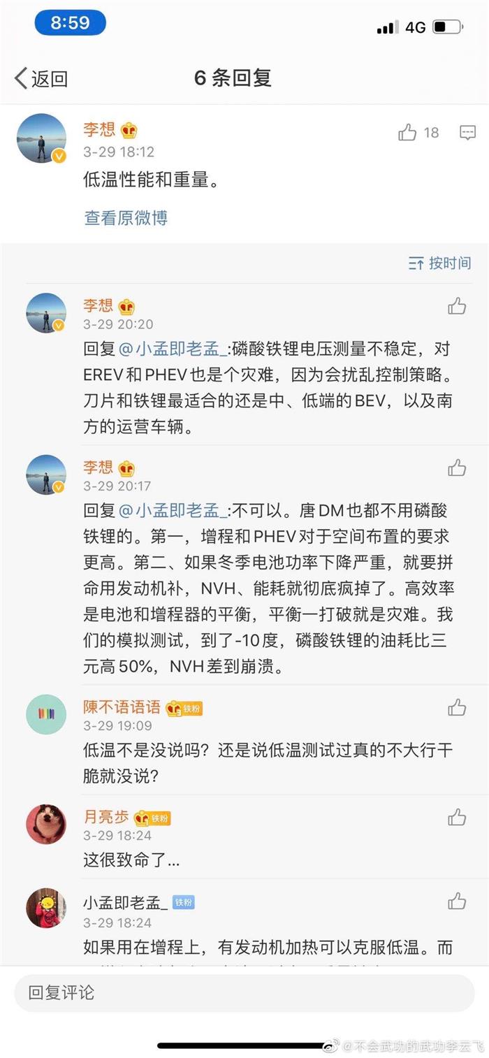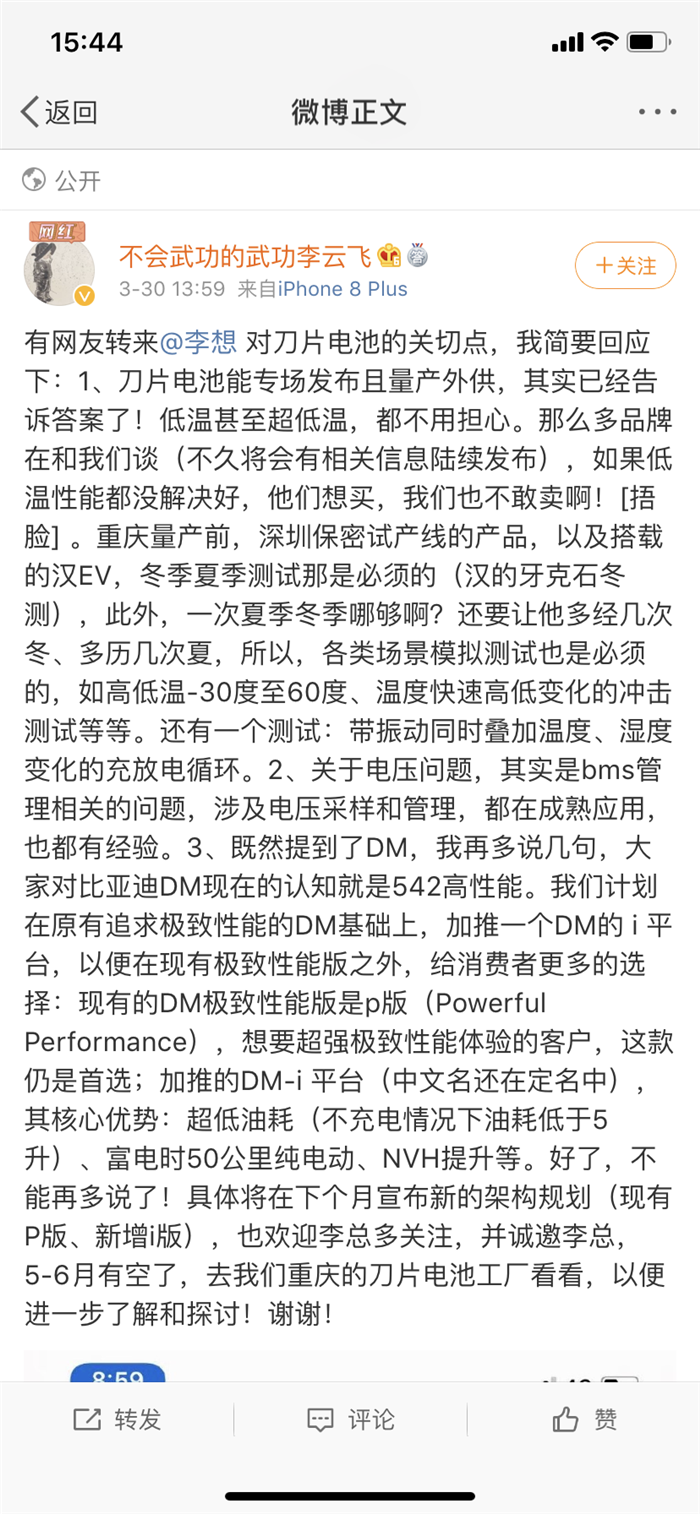 从这张图片可以看到,李云飞的回答十分巧妙,他并没有从专业角度进行解读,而是从市场的方向告诉所有人,“刀片电池”低温性能是值得信赖的。不过,坦白地讲,即使是这样,还是不能让人信服,因为他的解答“太侧面”了。而且更重要的是——实践是检验真理的唯一标准。