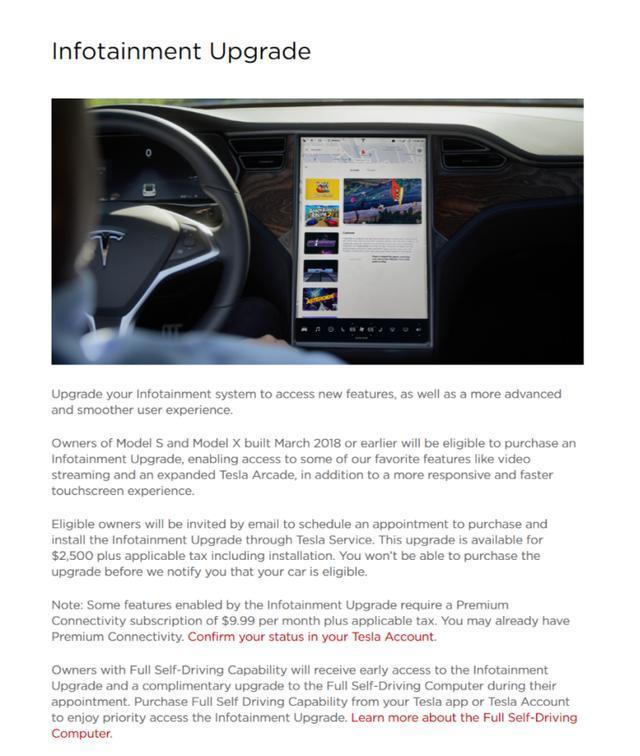 在此背景之下,2020年3月2日,美国新能源车企特斯拉针对信息娱乐系统的车机芯片终于推出了官方升级方案,即将驱动中控大屏的芯片从英伟达Tegra 3 升级为英特尔Atom A3950,而本次涉及的升级对象为2018年3月之前所生产的Model S与Model X车型,升级价格2,500美金。