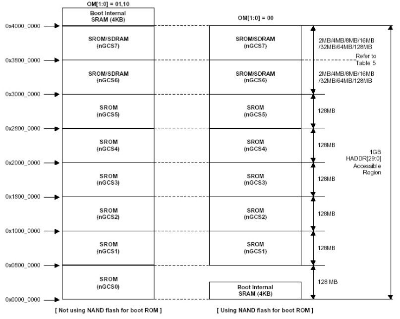 这里的地址空间只是存储器的地址空间,还有CPU内部的寄存器地址空间,这些地址也是可以直接访问的,同常在高位地址。S3C2440的寄存器地址空间为0x4800000~0x5fffffff。