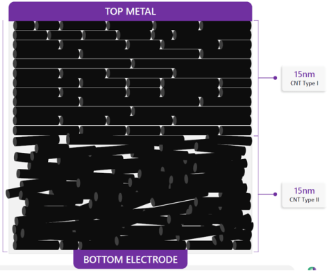 虽然可能有大量的碳纳米管,但只有底部几埃的碳纳米管会发生切换,因此该技术对碳纳米管的厚度不敏感。另一个挑战是,电极上的金属倾向于穿透空间,使电池短路。Gervasi:“IBM和三星尝试过,但失败了;他们试图让整个单元转换。“Nantero所做的是添加了第二层不同种类的CNT。开关层是一个编织的随机物质,而上层有碳纳米管,碳纳米管与碳垫对齐。碳垫作为金属的屏障,保护细胞。