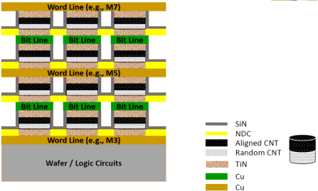 在制造过程中,碳纳米管被纺成晶圆片,然后蚀刻以分离单个晶圆Cell。也可以在一个交叉点阵列中堆叠多层单元组来优化性能。创建的拼接的宽度、深度和高度都达到了预期的性能,才能与DDR4内存时序相匹配。他们的DDR4设备有四层。一旦拼接被设计,它可以重复创造所需的整体能力。