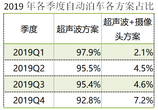 从上表可以看出,2019 年中国乘用车市场已预装自动泊车的新车中,纯超声波方案仍占绝对主流,超声波+视觉融合方案占比只有个位数,但是超声波+视觉融合方案从第四季度起有明显上升。 自动泊车装配率不高的原因,在于传统超声波泊车方案应用场景有限,驾驶员还需坐在车里,用户满意度不高。目前的解决办法有两个,一个是增强超声波雷达性能,一个是加入更多传感器(譬如摄像头和毫米波雷达)。