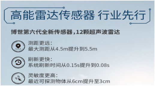 譬如 2019 年上半年上市的广汽 AionS 的自动泊车系统采用 12 颗博世第六代超声波雷达,比上一代测距更远,刷新更快,灵敏度更高,最近可探测物体从 6cm 提升至 3cm。