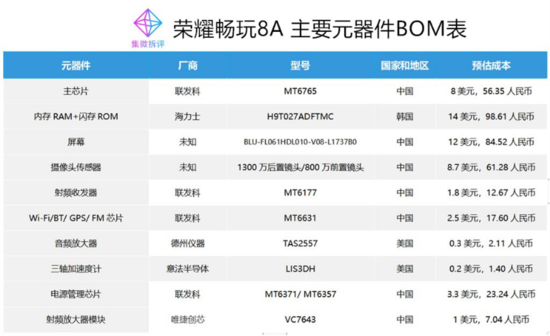 2020年04月15日 | 荣耀畅玩8A国产元器件成本超过7成
