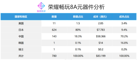 我们通过拆解,荣耀畅玩8A整机共有780个组件,日本提供624个组件,占总共的80%,组件数占比最高,成本占比9.4%,主要区域在分立器件。