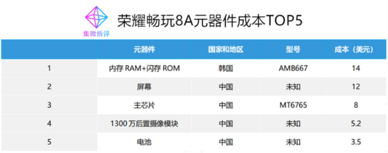 我们归纳整理了荣耀畅玩8A成本排名前5的元器件,由于采用成本较低的国产屏幕,联发科芯片,3GB RAM+32GB ROM顺理成章的排名第一。比较意外的是成本3.5美元的电池上榜了,由此看来荣耀畅玩8A其他元器件的成本真的很低。