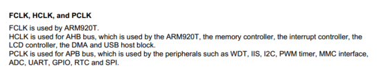 中文翻译:FCLK、HCLK和PCLK,FCLK由ARM920T使用。HCLK用于AHB总线,由ARM920T、内存控制器、中断控制器、LCD控制器、DMA和USB主机块。PCLK用于APB总线,用于WDT、IIS、I2C、PWM定时器、MMC接口等外围设备,ADC、UART、GPIO、RTC和SPI。
