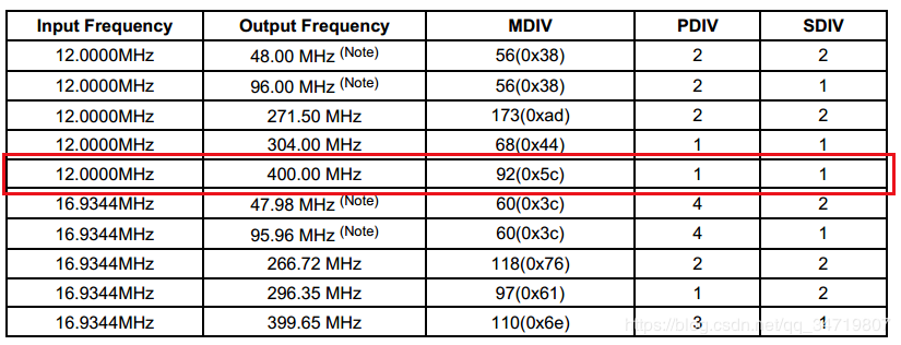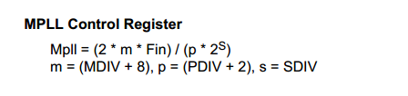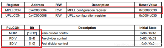 讲解:设置MPLLCON:FCLK=400M→MDIV=92,PDIV=1 ,SDIV=1