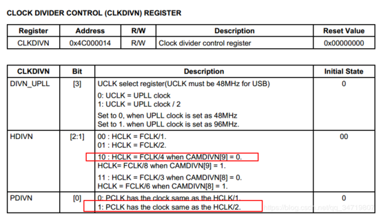 设置CLKDIV的HDIVN[2:1]=10且CAMDIVN[9]=0(默认为0,如果没使用可以不修改):HCLK=FCLK/4