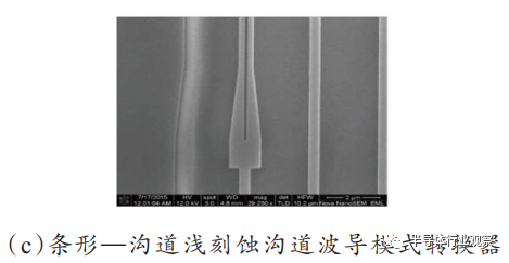 硅材料热光系数大的特点导致硅基光波导系统对周围温度环境的变化极为敏感,这对诸如硅基片上波分复用系统的工作波长将造成极大的影响,通常需要额外的温控管理来稳定工作状态。如图(4d)所示,利用非对称MMI实现的任意分束比1×2光功率分束器能够作为片上监测单元为控制系统提供反馈。为降低温控额外引入的能耗,可以通过设计温度不敏感的片上滤波器来实现。北京大学周治平课题组[32-34]针对常见的3种温度不敏感滤波器都进行了研究,包括微环型、马赫-曾德干涉型和阵列波导光栅型。微环型滤波器可以利用双环耦合谐振谱分裂的现象来抵消热光效应引起的波长漂移,避免使用与CMOS工艺不兼容的负热光系数材料[35]。马赫-曾德型滤波器采用两种具有不同有效折射率的波导作为马赫-曾德干涉器的两臂可以实现温度不敏感特性[36-37]。利用有效热光系数差更大的条形波导与沟道浅刻蚀型波导,结合多级级联的马赫-曾德干涉结构,实现器件尺寸更紧凑的温度不敏感平顶滤波器,如图4(a)[38-39]所示,为了克服条形波导与沟道浅刻蚀波导模式失配问题,同时提出了一种条形波导与沟道浅刻蚀波导的模式转换器,如图4(c)[40-42]所示。阵列波导光栅型滤波器以往的设计存在所用材料与CMOS工艺不兼容,特征尺寸小等问题,借鉴马赫-曾德型滤波器两臂采用不同类型波导的做法,可以实现温度不敏感的阵列波导光栅性滤波器,如图4(b)[43]所示,并设计了任意比例作为片上监测单元为控制系统提供反馈[44-45]。