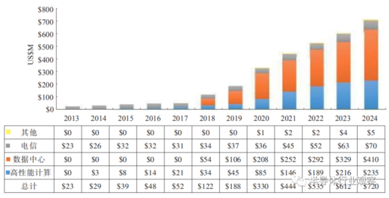 如上所述,硅基光电子技术在数据中心、通信、高性能计算和人工智能领域已经彰显出巨大应用价值,其市场规模如图9[51]所示,到2020年,总市场规模将达到3亿美元以上。数据中心和通信将是硅基光电子技术应用的核心应用场景,但随着高性能计算领域的瓶颈凸显,硅基光电子在高性能计算领域的市场份额也将迅速增长。