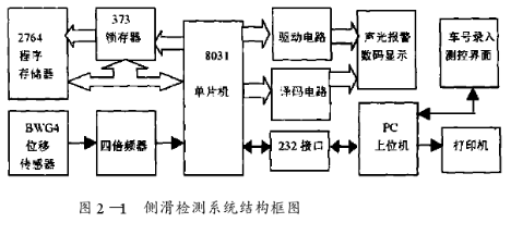 侧滑检测系统由上、下位机两部分组成,系统结构如图2—1所示。以单片机为核心构成的下位机集自动检测、判别、报警及数显于一体,配上单板侧滑台可独立完成侧滑检测任务;上位机因人机界面好、资源丰富,使系统便于对采集的数据进行分析、运算、存盘、打印和检测控制。