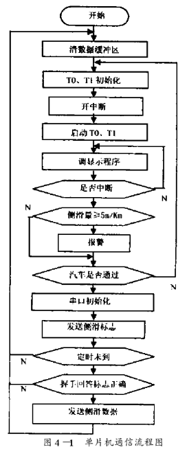 下位机平时处于数据采集状态,每次将采集的动态最大侧滑量和内外滑标志保存在单片机内数据缓冲区的两个存储单元中。当汽车通过滑板后,存储单元中的数据将不再变化,单片机通过检测存储单元中的数据变化情况判断汽车通过后,自动转入通信程序将检测数据传给上位机。为提高系统工作效率,通信采用中断与查询相结合的方式编程,图4—1单片机通信流程图机先将内(外)滑标志作为握手信号传给上位机申请中断,并检测串口等待微机回答,若回答正确,则向上位机发送有效数据,若在一定时间内未收到上位机的正确回答,则清数据缓冲区,返回数据采集状态。单片机检测通信流程见图4—1。