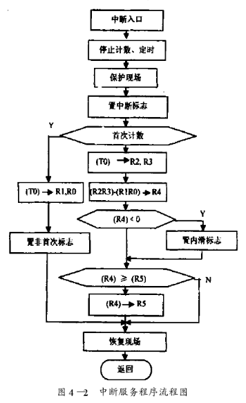 中断服务程序将复位后第一次得到的频率作为中心频率送入指定单元保存,其后每次测得的频率都与中心频率比较,结果大于零置外滑标志,否则置内滑标志,并将最大的比较结果送数据缓冲区保存。中断服务程序流程如图4—2所示。