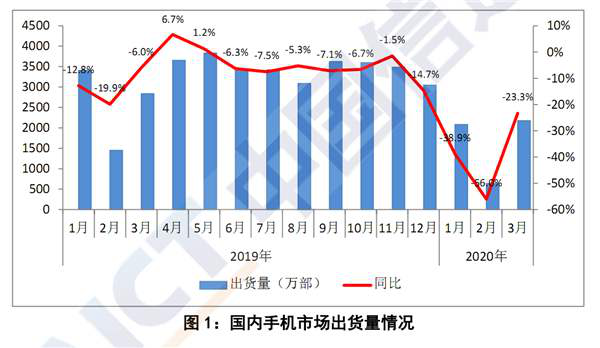 据中国信通院4月13日最新发布的数据显示:2020年3月,国内手机市场总体出货量2175.6万部,同比下降23.3%。其中2G手机出货69.8万部、4G手机出货1484.4万部、5G手机出货621.5万部。今年一月国内手机出货量同比下跌38.9%,2月疫情发展最为严重,同比下跌56%,三月份下跌得到放缓,同比下降23.3%。