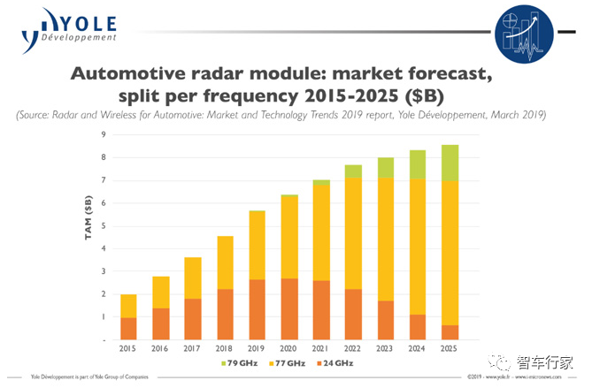 据半导体行业著名产业研究机构 Yole Développement 预测,全球车载雷达市场到 2025 年将达到 86 亿美元,年复合年增长率达 15.6%。全球车载雷达市场到 2025 年将达到 86 亿美元,年复合年增长率达 15.6%。