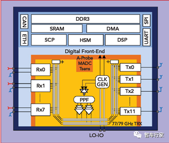 所有通道使用限幅放大器和次谐波正交注入锁定振荡器,以 5×注入低频产生毫米波载波。数字信号处理和其他雷达信号计算能力由两个带浮点支持的 CPU 和两个 DSP 在同一芯片上支持。整个软件定义的硬件管道能够进行高达 20tera 的 Ops 基带处理。这是相当多的模拟和数字内容打包到一个芯片上。