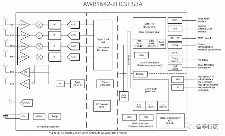 它被设计成与一个控制器 / 处理器集成在一个完整的雷达传感器中,该控制器 / 处理器负责:通过从接口对其进行配置;接收 / 处理通过主接口产生的原始雷达数据(如果来自每个接收通道,则对其进行采样)。